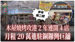 木屋烧烤于2023年11月首度攻港,承租旺角创兴广场地下一个铺位,面积约2,583方尺,月租约26.8万,平均尺租约103元。旺角店去年4月正式开业,相当旺场,同年5月,木屋烧烤位于西环德辅道西402及404号创业中心的分店开业,该铺面积约3,442方尺,月租约25万,平均尺租73元。木屋烧烤将军澳中心分店在今年4月28日正式营业,意味著木屋烧烤今年已连开两店。