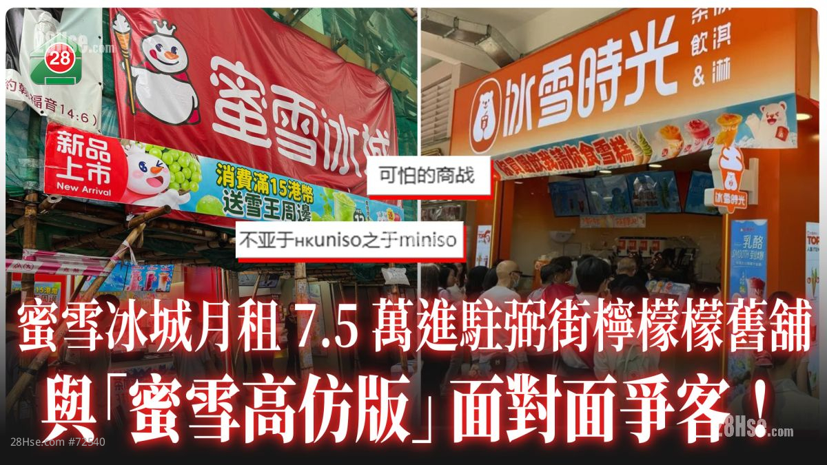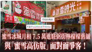 而另一个内地茶饮品牌「冰雪时光」,早前以月租约16.8万元承租旺角弼街49号地铺,店铺面积约350平方尺,尺租约480元。蜜雪冰城进驻后,与冰雪时光隔街对望,被网民笑指「可怕的商战」、「不亚于hkuniso之于miniso」。